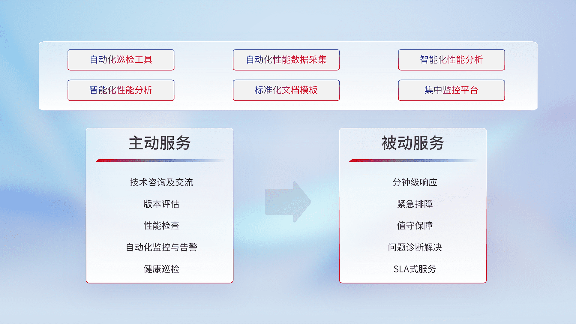 智能化工具和标准化文档,,,保障服务质量,,,提供主动服务(包含技术咨询、、版本评估、、性能检查、、、、自动化监控与告警、、、健康巡检)和被动服务包含(分钟级响应、、、紧急排障、、、值守保障、、、、问题诊断解决、、、SLA服务)。。。。