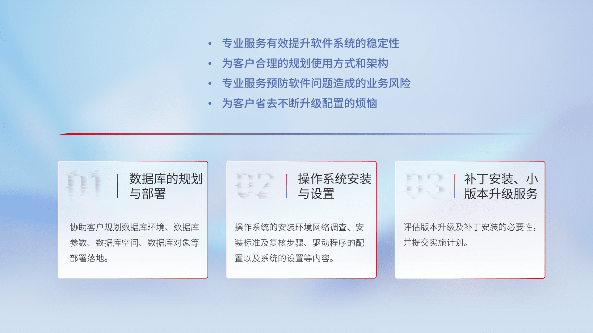 为客户提供软件规模升级、、、、快速部署、、、按需配置的专业服务,,,从数据库的规划与部署到操作系统的安装与设置,,,再到补丁安装和小版本升级提供支持。。